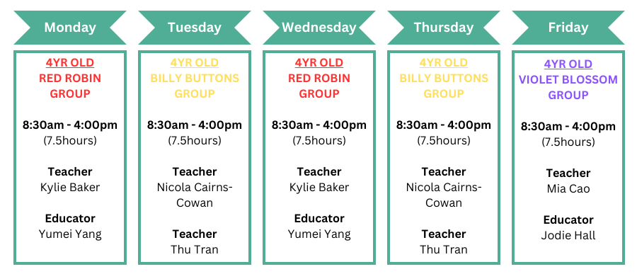 Our Bilby Room runs our Red Robin, Billy Buttons and Violet Blossom group 4 year old programs (Violet Blossom Group also has a day in Possum Room).