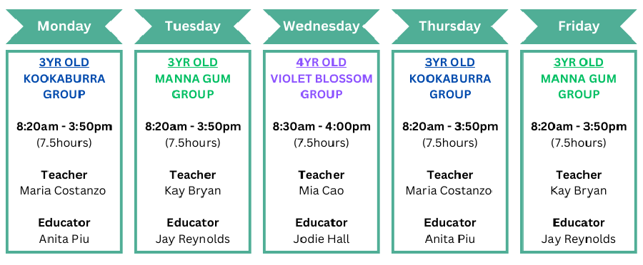 Our Possum Room runs our Manna Gum and Kookaburra group 3 year old programs and our Violet Blossom group 4 year old program (also has a day in Bilby room).